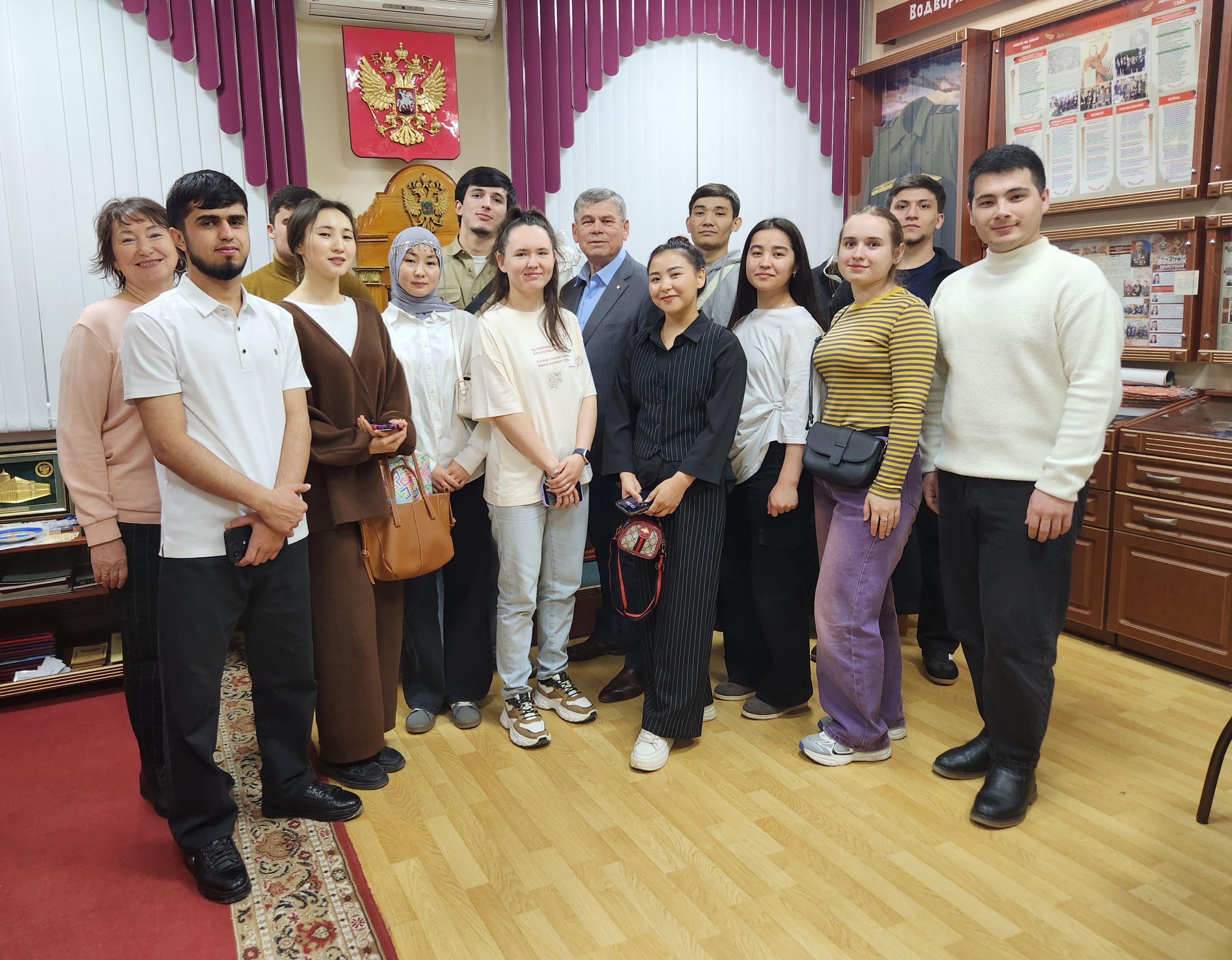 форме. После беседы в зале студенты прошли в Музей Правосудия Республики Марий Эл, расположенный на втором этаже здания суда, где Анатолий Викторович рассказал об истории создания музея, его структуре, людях, работавших в судебной системе Республики Марий Эл, уделив большое внимание экспозиции, посвященной участникам Великой Отечественной войны. Экскурсия завершилась традиционным фотографированием. |