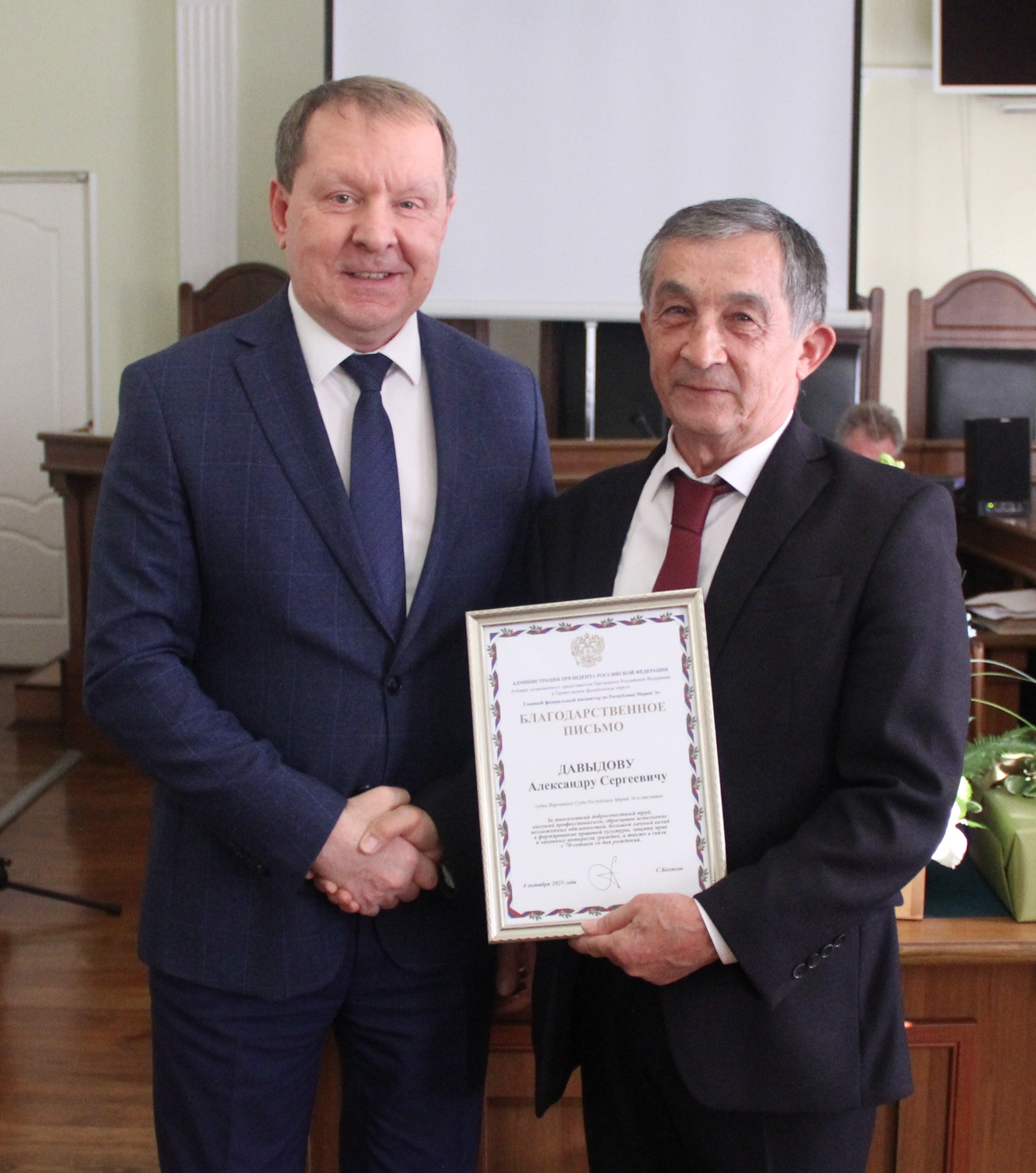 Весь коллектив суда собрался, чтобы поздравить с юбилеем Председателя Верховного Суда Республики Марий Эл в отставке Александра Сергеевича Давыдова, который 4 октября 2025 года отметил свой 70-й юбилейный день рождения. Председатель Верховного Суда Республики Марий Эл А.В. Грачев объявил о присвоении А.С. Давыдову за особые заслуги перед судебной системой почетного звания «Ветеран судебной системы». С юбилеем поздравили председатели совета судей, экзаменационной комиссии, квалификационной коллегии судей Республики Марий Эл. Много теплых слов прозвучало в адрес Александра Сергеевича от судей судебной коллегии по уголовным делам, судебной коллегии по гражданским и административным делам, сотрудников аппарата суда. Поздравить юбиляра с праздником пришли Главный федеральный инспектор по Республике Марий Эл С.Г. Беляков, мировые судьи.