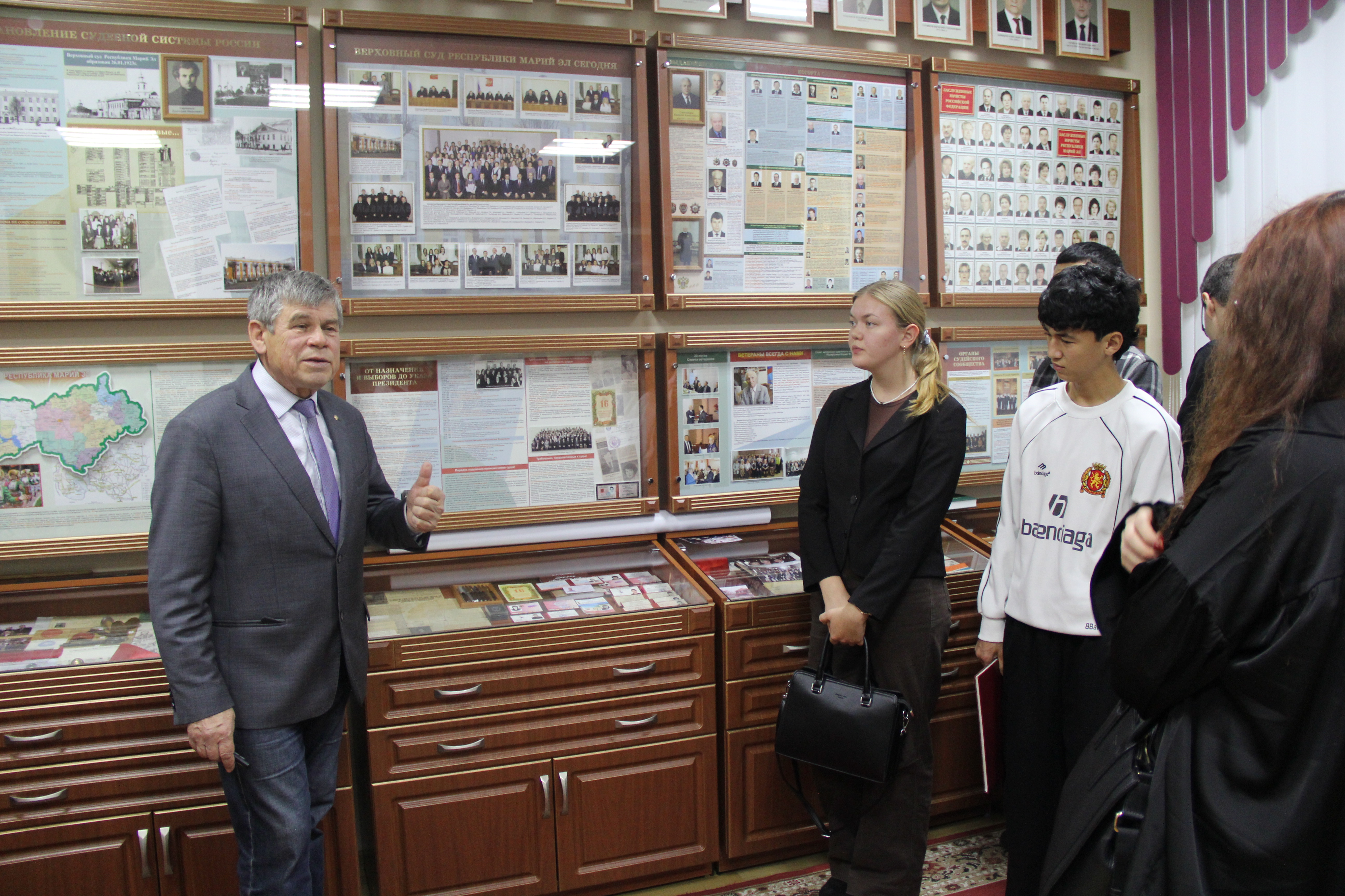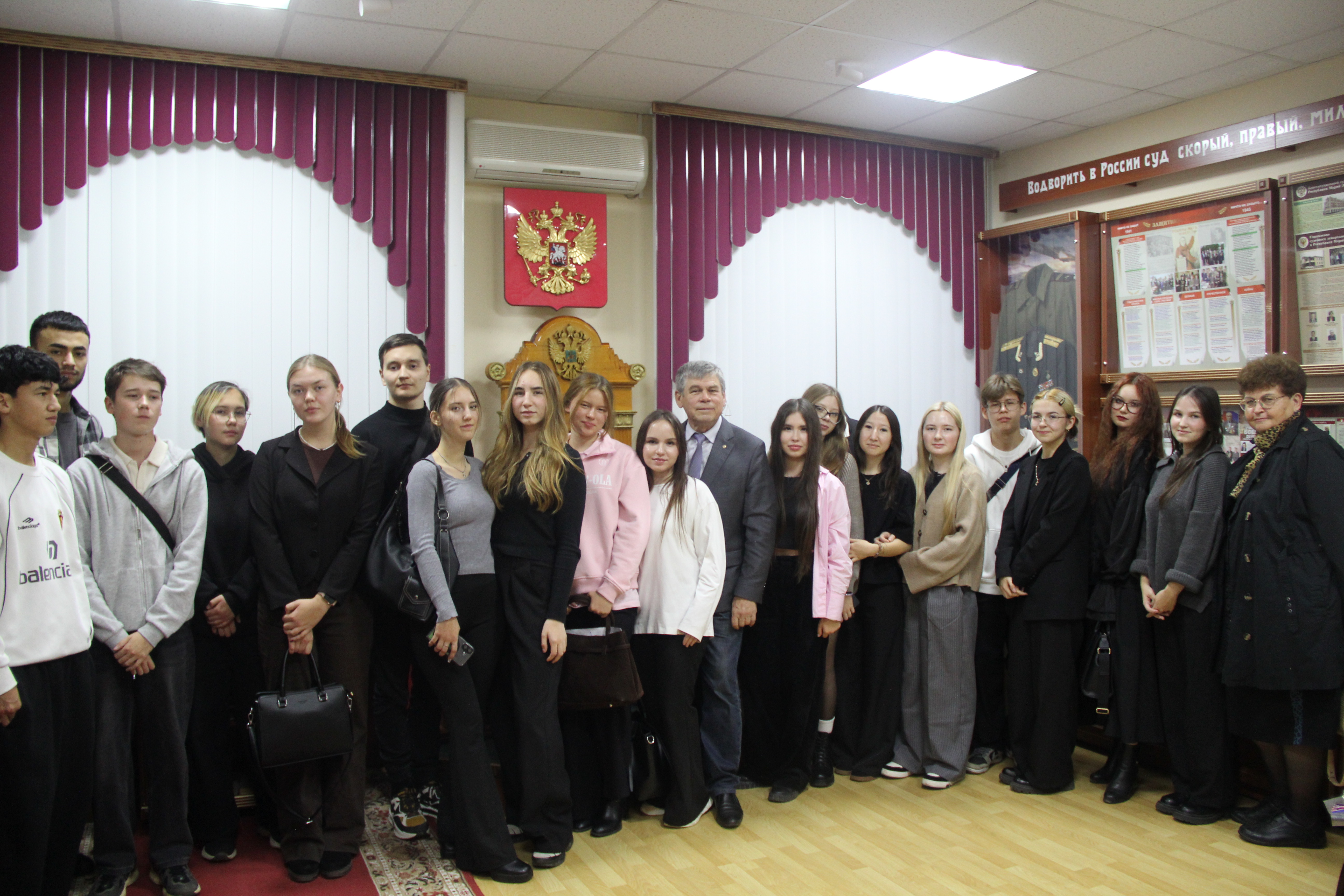 14 октября 2025 года Верховный Суд Республики Марий Эл посетили студенты 1-2 курсов, обучающиеся по программе среднего профессионального образования на базе юридического факультета Марийского государственного университета. Руководитель Музея Правосудия, судья Верховного Суда Республики Марий Эл в отставке Иваков А.В. встретился со школьниками в зале судебного заседания, где провел с ними беседу о праве. В зале судебного заседания ребята увидели герб и флаг России над креслом судьи, места для прокурора, адвокатов, место, в котором находится подсудимый во время судебного заседания. После беседы в зале прошли в Музей Правосудия Республики Марий Эл, расположенный на втором этаже здания суда, где Иваков А.В. рассказал об истории создания музея, его структуре, людях, работавших в судебной системе Республики Марий Эл. Экскурсия завершилась традиционным фотографированием. |