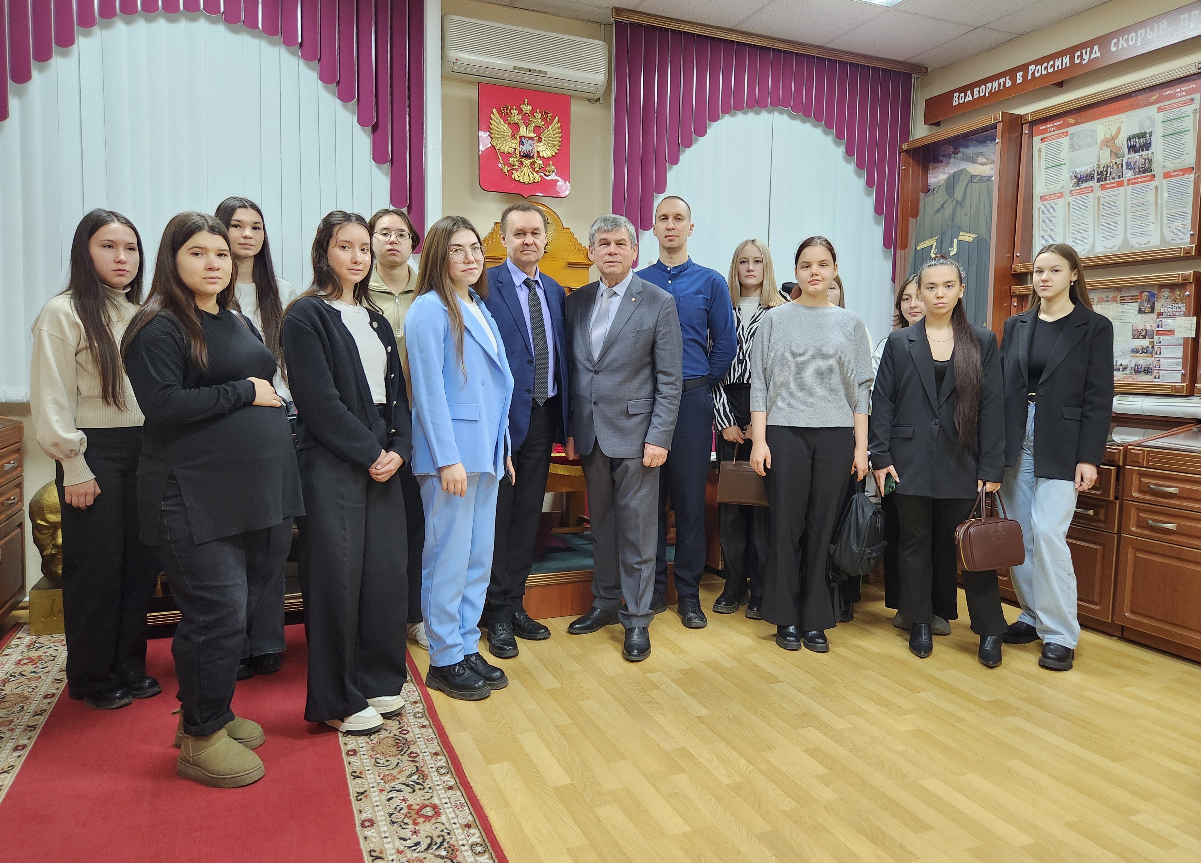 28 ноября 2025 года Верховный Суд Республики Марий Эл посетили студенты 3 курса Йошкар-Олинского техникума сервисных технологий, обучающиеся по программе «Юриспруденция». Руководитель Музея Правосудия, судья Верховного Суда Республики Марий Эл в отставке Иваков А.В. встретился с ними в зале судебного заседания, где провел беседу о праве. В зале судебного заседания ребята увидели герб и флаг России над креслом судьи, места для прокурора, адвокатов, место, в котором находится подсудимый во время судебного заседания. После беседы в зале прошли в Музей Правосудия Республики Марий Эл, расположенный на втором этаже здания суда. Рядом с Музеем оформлена экспозиция к 80-летию Победы в Великой Отечественной войне 1941-1945 годов, которой Анатолий Викторович уделил особое внимание детей.