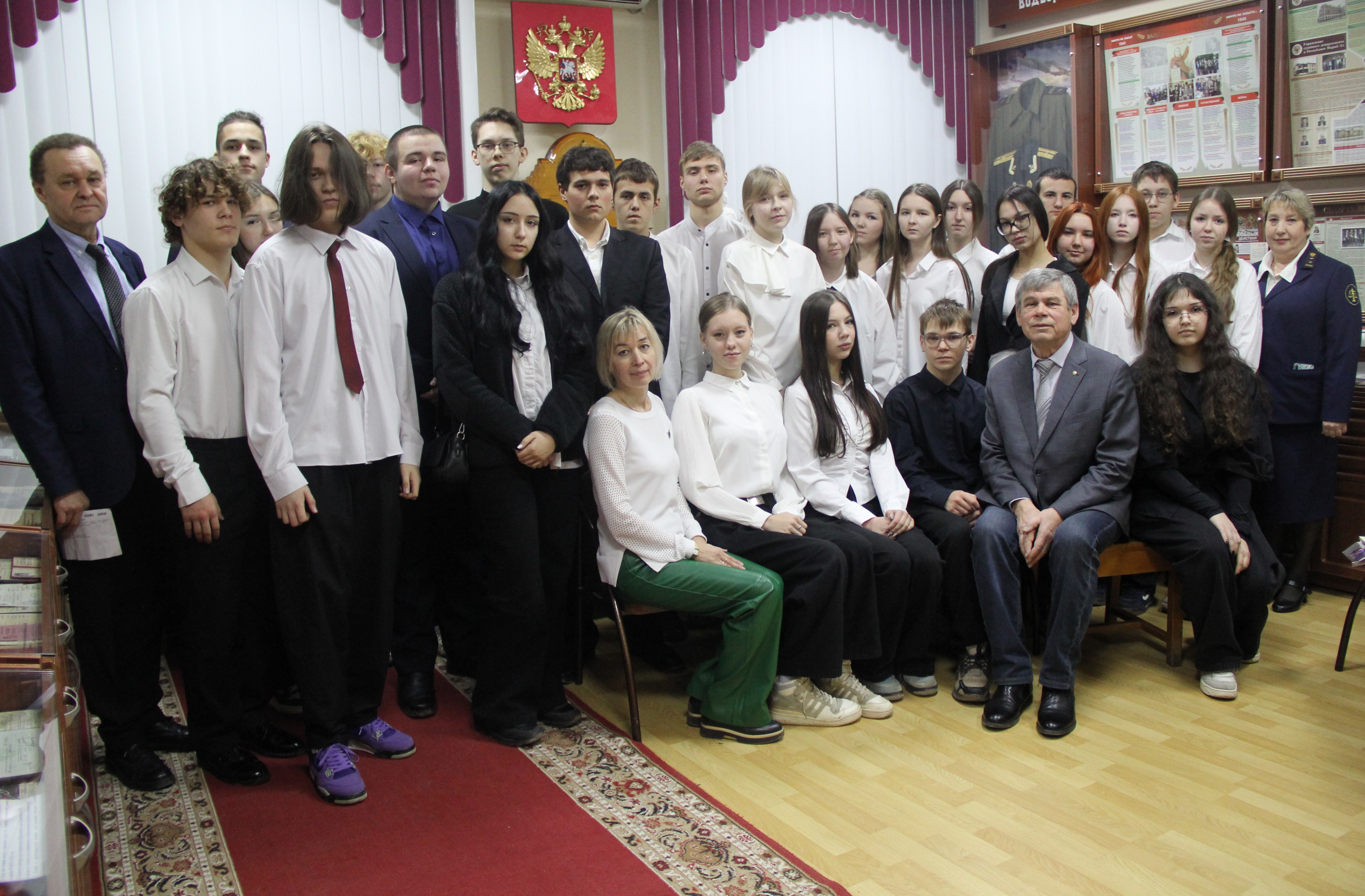 5 декабря 2025 года Верховный Суд Республики Марий Эл посетили ученики 10 класса Средней общеобразовательной школы № 17 г.Йошкар-Олы. Руководитель Музея Правосудия, судья Верховного Суда Республики Марий Эл в отставке Иваков А.В. встретился с ними в зале судебного заседания, где провел беседу о праве. В зале судебного заседания ребята увидели герб и флаг России над креслом судьи, места для прокурора, адвокатов, место, в котором находится подсудимый во время судебного заседания. После беседы в зале прошли в Музей Правосудия Республики Марий Эл, расположенный на втором этаже здания суда. Анатолий Викторович рассказал детям об истории создания музея, его структуре, людях, работавших в судебной системе Республики Марий Эл. Экспонаты музея, а их уже около 3 тысяч, отражают путь становления судебной системы в нашей республике. Среди них есть поистине уникальные предметы - подлинники удостоверений судей, отправлявших правосудие в 20 - 30-х годах прошлого столетия, собрание подшивок юридических журналов с 1922 года, юридическая литература разных лет. Здесь хранятся архивные документы, личные вещи, государственные и ведомственные награды судей, работников аппарата судов марийского края, отражающие человеческие судьбы. Стены музея украшают фотографии председателей областного (Верховного) суда нашей республики. В экспозициях представлены фотографии заслуженных юристов Республики Марий Эл и Российской Федерации, наших знаменитых земляков, добившихся значительных успехов в сфере юриспруденции, участников Великой Отечественной войны. В музее собраны фотографии всех действующих судей, представлены воспоминания ветеранов судебной системы. Отдельная экспозиция отведена творческим и спортивным увлечениям судей и работников аппарата суда - они пишут книги, стихи, занимаются спортом. К экскурсии в Музее Правосудия Республики Марий Эл присоединился председатель Медведевского районного суда Республики Марий эл в отставке Е.В. Ильин. Экскурсия завершилась традиционным фотографированием.
