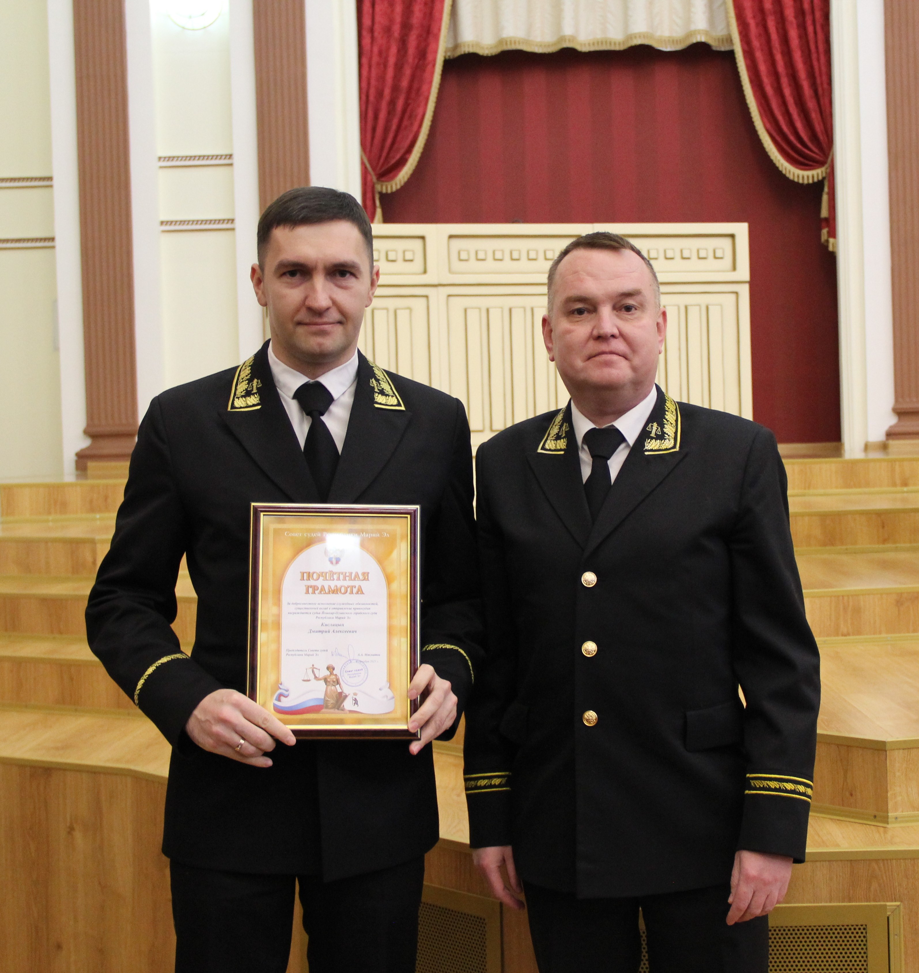 По итогам работы судов общей юрисдикции состоялось награждение судей. Награды вручил председатель совета судей Республики рий Эл А.А. Макматов. - судья Йошкар-Олинского городского суда Республики Марий Эл Кислицын Дмитрий Алексеевич, - мировой судья судебного участка № 2 Йошкар-Олинского судебного района Республики Марий Эл Лебедева Татьяна Ивановна, - мировой судья судебного участка № 21 Горномарийского судебного района Республики Марий Эл Миловидова Фаина Геннадьевна. За добросовестное исполнение служебных обязанностей, внесение существенного вклада в отправление правосудия Благодарность Совета судей Республики Марий Эл объявлена: - судье Медведевского районного суда Республики Марий Эл Ивановой Лилии Николаевне, - мировому судье судебного участка № 20 Горномарийского судебного района Республики Марий Эл Габдуллину Рамису Фадбировичу. |