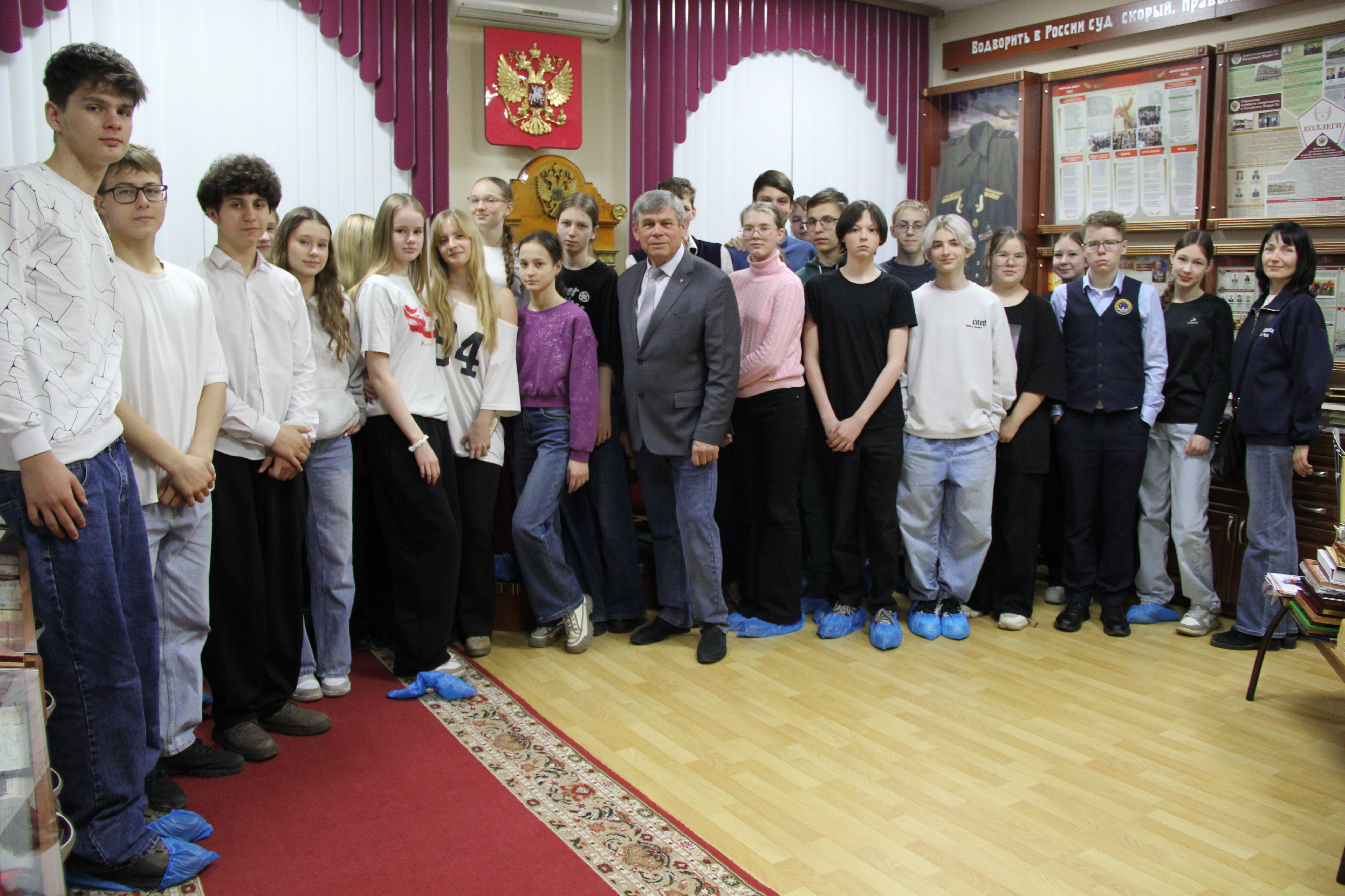 9 апреля 2026 года Верховный Суд Республики Марий Эл посетили учащиеся 8 класса Средней общеобразовательной школы № 5 «Обыкновенное чудо». Руководитель Музея Правосудия, судья Верховного Суда Республики Марий Эл в отставке А.В. Иваков встретился с ними в зале судебного заседания, где провел беседу о праве. В зале судебного заседания ребята увидели герб и флаг России над креслом судьи, места для прокурора, адвокатов, место, в котором находится подсудимый во время судебного заседания. После беседы в зале прошли в Музей Правосудия Республики Марий Эл, расположенный на втором этаже здания суда. Около музея размещены стенды, посвященные ветеранам Великой Отечественной войны 1941-1945 годов. Анатолий Викторович знает историю каждого ветерана, изображенного на нем, и делится рассказами из их жизни с детьми. Ребята познакомились с историей становления судебной власти в республике, увидели ценные экспонаты, которых в музее уже около 3 тысяч: подлинники удостоверений судей, отправлявших правосудие в 20 - 30-х годах прошлого столетия, собрание подшивок юридических журналов с 1922 года, юридическую литературу разных лет, личные вещи, государственные и ведомственные награды судей, работников аппарата судов марийского края. Такие встречи помогают школьникам расширить их кругозор, а старшеклассникам сориентироваться в выборе будущей профессии.